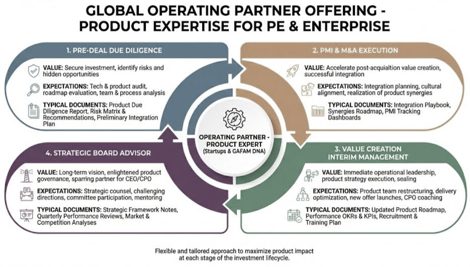 En tant qu'Operating Partner, j'accompagne les fonds de Private Equity & VC aux étapes critiques du cycle d'investissement : l'évaluation des risques Pré-Deal, pour identifier la dette technique et les freins à la scalabilité, et la création de valeur Post-Deal, pour transformer la thèse d'acquisition en réalité opérationnelle.J'accélère la croissance et structure l'organisation pour le passage à l'échelle, en collaborant avec les CEOs et Fondateurs qui naviguent la transition complexe de la Série B jusqu'à l'Exit, garantissant ainsi que les fondations techniques soutiennent des objectifs de revenus ambitieux.